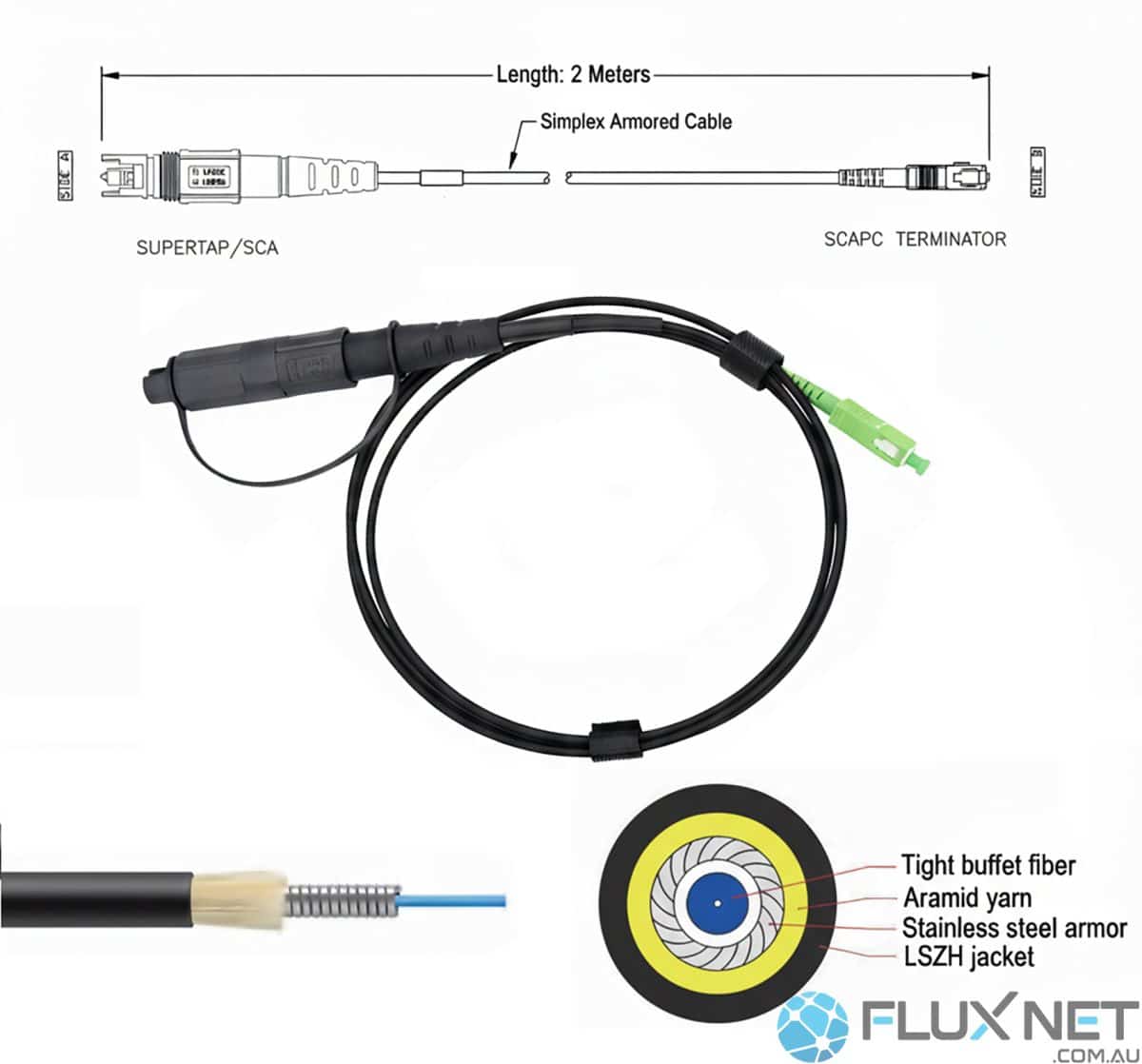 Introducing the ultimate solution for NBN contractors: our 2M Armored Heavy-Duty OptiTap to SCA Fibre Patchcord. Engineered for extreme reliability and durability, this cable is a game-changer for field testing and installations on the Australian NBN network.